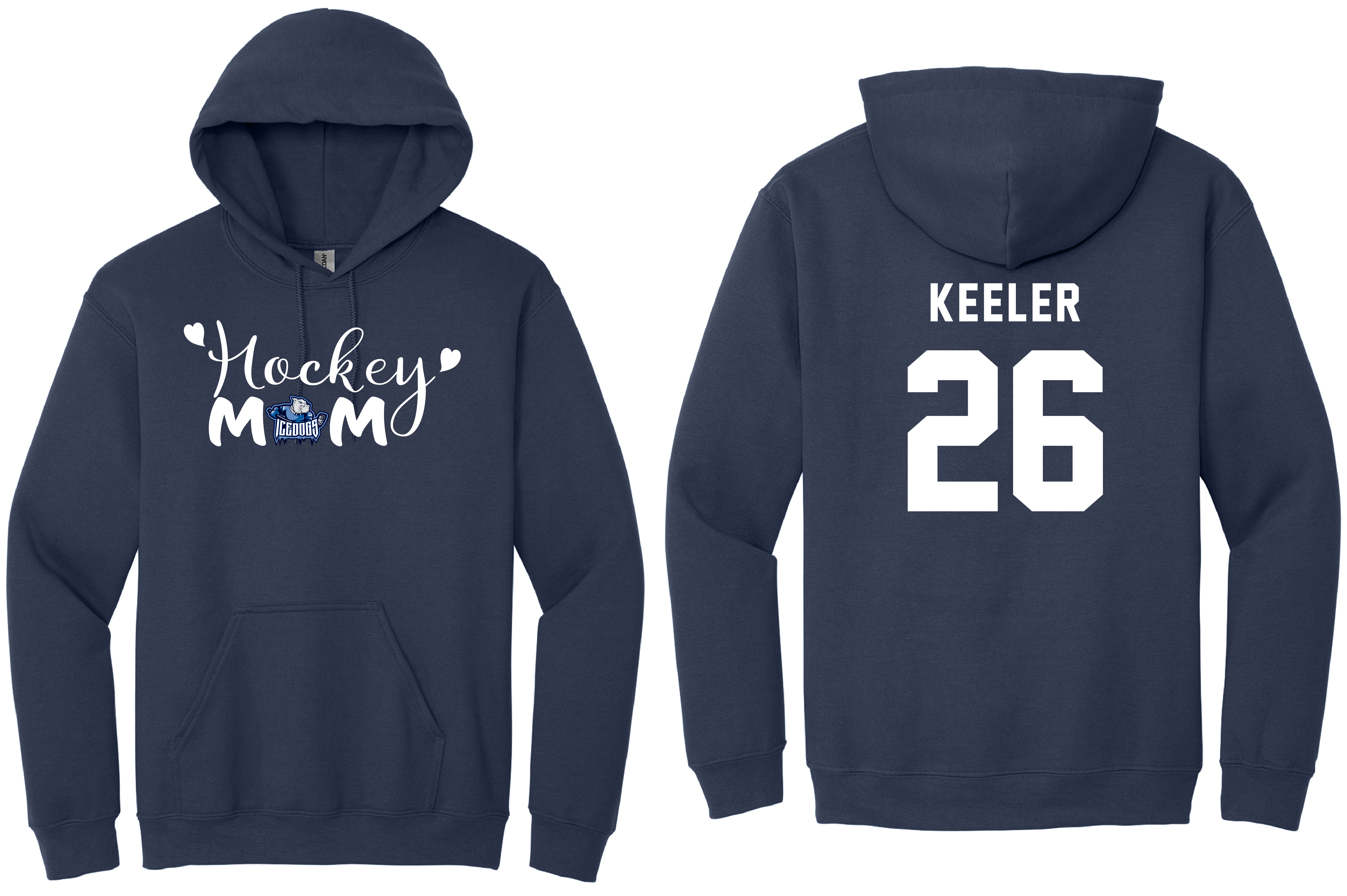 Screen printed Hockey MOM hoodie with option to add name and or number on back.